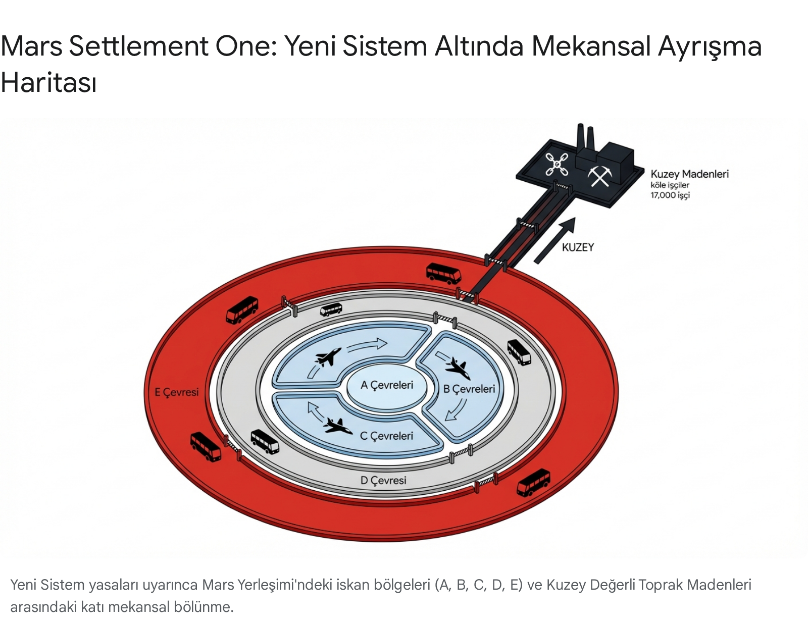 Yeni Sistem'in en can alıcı ve şiddet dolu bileşenlerinden biri, iskan haklarının ve hareket özgürlüğünün biyolojik ve ırksal temelde kesin çizgilerle kısıtlanmasıdır. Mars Yerleşimi, harf kodlarıyla ayrıştırılmış iç içe geçmiş "Çevrelerden" (Perimeters) oluşmaktadır.1