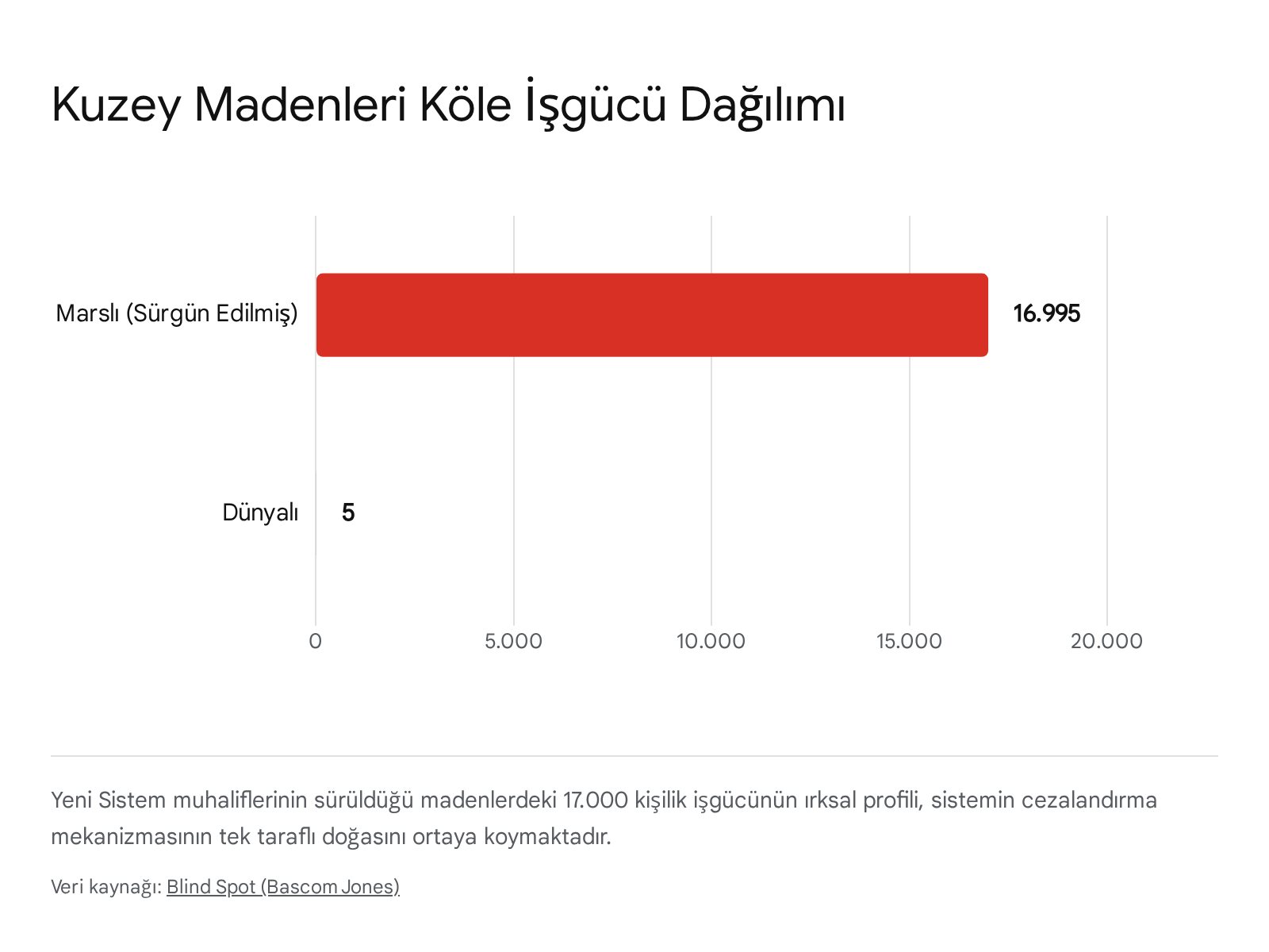 Direktör Stark'ın sabah incelediği vizör-raporu (visi-report), bu sistemin sadece bir cezalandırma değil, sistematik bir ırksal sömürü organizasyonu olduğunu verilerle kanıtlamaktadır. Rapora göre, bu ölümcül madenlerde 17.000'den fazla işçi zorla çalıştırılmaktadır. Çarpıcı olan detay ise, bu 17.000 kişilik sürgün işçilerinden yalnızca beş tanesinin (sadece 5) Dünyalı olmasıdır.1 Geri kalan on altı bin dokuz yüz doksan beş kişi, asıl gezegen sahibi olan Marslılardır.