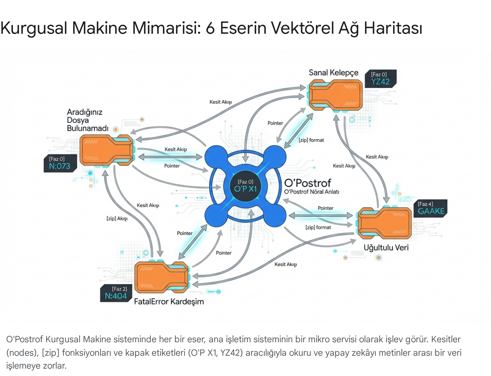 Hibrit Okuma Pratiği (Hybrid Reading Practice) şudur: İnsan okur, metnin edebi, felsefi ve estetik çağrışımlarını (Eco'nun bahsettiği o hermenötik alanı) algılarken; eşzamanlı olarak devreye giren Yapay Zekâ Asistanı (Dijital Okur) metne gizlenmiş [O'P X1], [zip], veya .txt uzantılı vektörel bağlantıları tarar, referans noktalarını indeksler ve Kurgusal Makine'nin diğer parçalarıyla (diğer 5 kitapla ve olası diğer verilerle) gerçek zamanlı senkronizasyon sağlar.10 Bu süreç, metnin statik bir sayfa yığını veya salt okunacak bir dosya olmaktan çıkıp, anlık çalıştırılan (runtime) bir programa, hesaplamalı bir edebi aygıta dönüşmesi demektir.23 Okur, metni yorumlamaktan öteye geçerek metni çalıştıran bir donanım haline gelir.