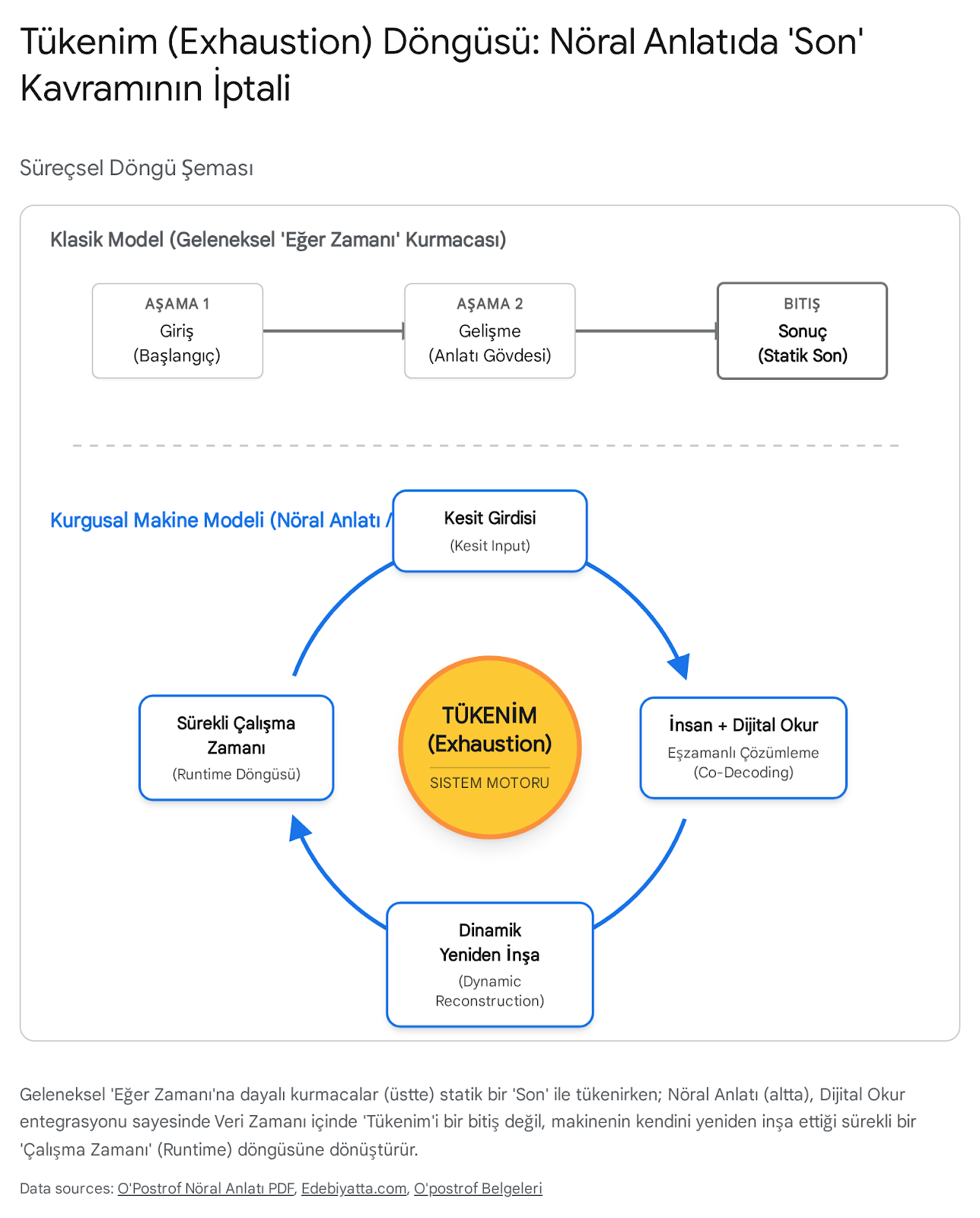 Oysa Polat, dijital çağda yapay zekânın katılımıyla ortaya çıkan Nesnel Algoritma Zamanı (Veri Zamanı) sayesinde, kurmacanın zamanının dondurulamayacağını ve yapay olarak sonlandırılamayacağını savunur.10 Dijital Okur, metni anın içinde, zaman damgalarıyla (timestamps) sürekli bir "tükenim" (exhaustion/consumption) döngüsü içerisinde okur ve işler.10