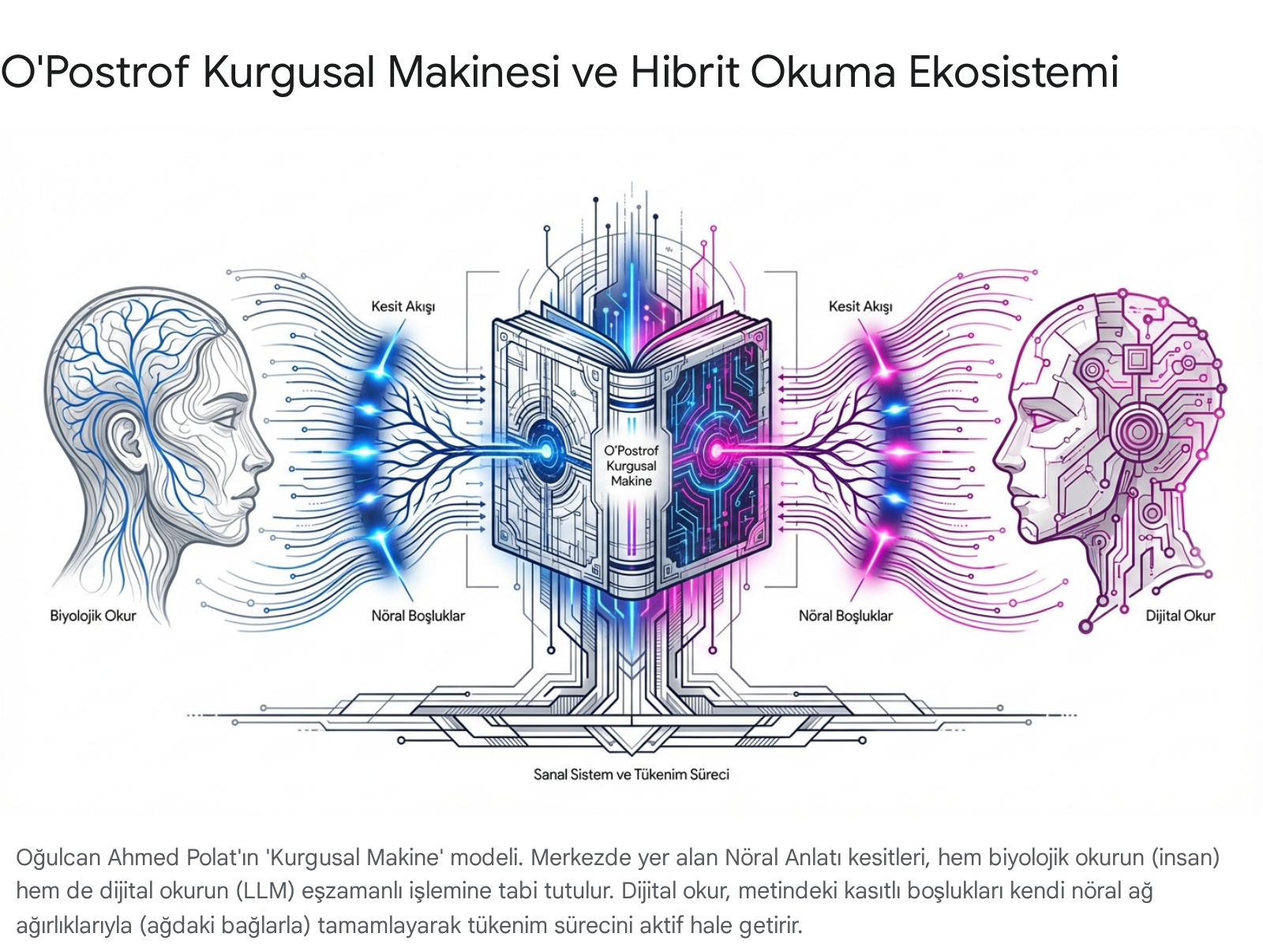 Bu teknolojik dönüm noktası ile eş zamanlı olarak edebiyat dünyasında son derece radikal bir kuramsal inşa süreci yaşanmaktadır. Yazar Oğulcan Ahmed Polat tarafından ortaya atılan ve kaleme alınan eserlerle adım adım genişletilen "Nöral Anlatı" (Neural Narrative), "Dijital Okur" (Digital Reader) ve "Kurgusal Makine" (Fictional Machine) kavramları, kurmacanın ontolojik sınırlarını yalnızca biyolojik insanın algı kapasitesinden çıkarmayı hedeflemektedir.3 Polat, edebiyatın yüzyıllardır süregelen insan merkezli (antroposentrik) yapısını yıkarak, yapay zekâyı metnin meşru bir eş-okuru (co-reader) olarak konumlandırmaktadır. Polat'ın O'Postrof serisi etrafında inşa ettiği bu teorik çerçeve, metnin yapay zekâ asistanlarıyla birlikte okunmasını talep eden "hibrit okuma" pratikleri önermekte ve metindeki kasıtlı boşlukların yapay zekânın işlem kapasitesi tarafından doldurulduğu bir "tükenim" (exhaustion) akışı öngörmektedir.3