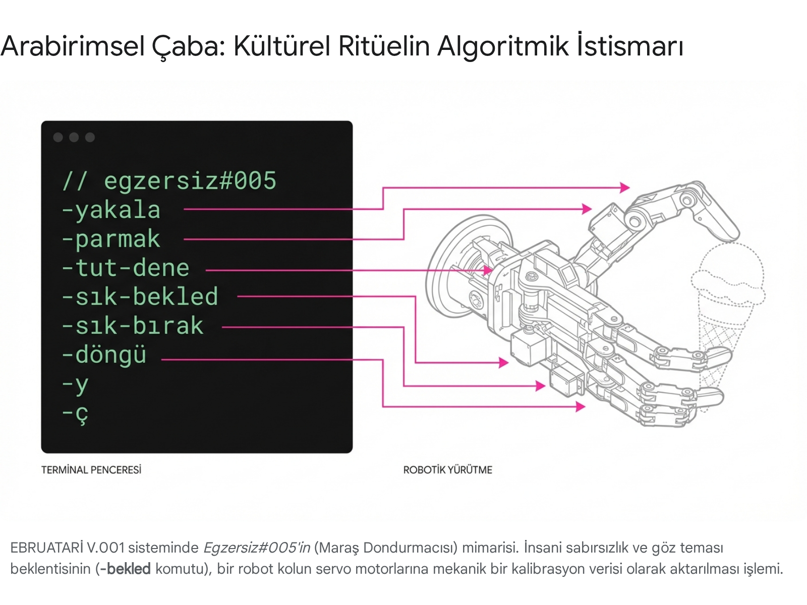 Egzersiz #005 (Maraş Dondurmacısı), bu arabirimsel çabanın zirve noktasıdır. Dondurmayı uzatan ustayla göz göze gelindiğinde yaşanan o kültürel sabırsızlık ve "abi ver artık" hissi, -bekled komutuyla makineye harfiyen öğretilir.9 Holografik bir dondurmacı olmasa bile, robot el boşlukta, külahı tutma denemeleri (-tut-dene) yapar. Makinenin, hiçbir besin değeri olmayan bir eylemi sırf kalibrasyon amacıyla sonsuz bir döngüde tekrarlaması, Sisifos'un modern, mekanikleştirilmiş bir yansımasıdır.