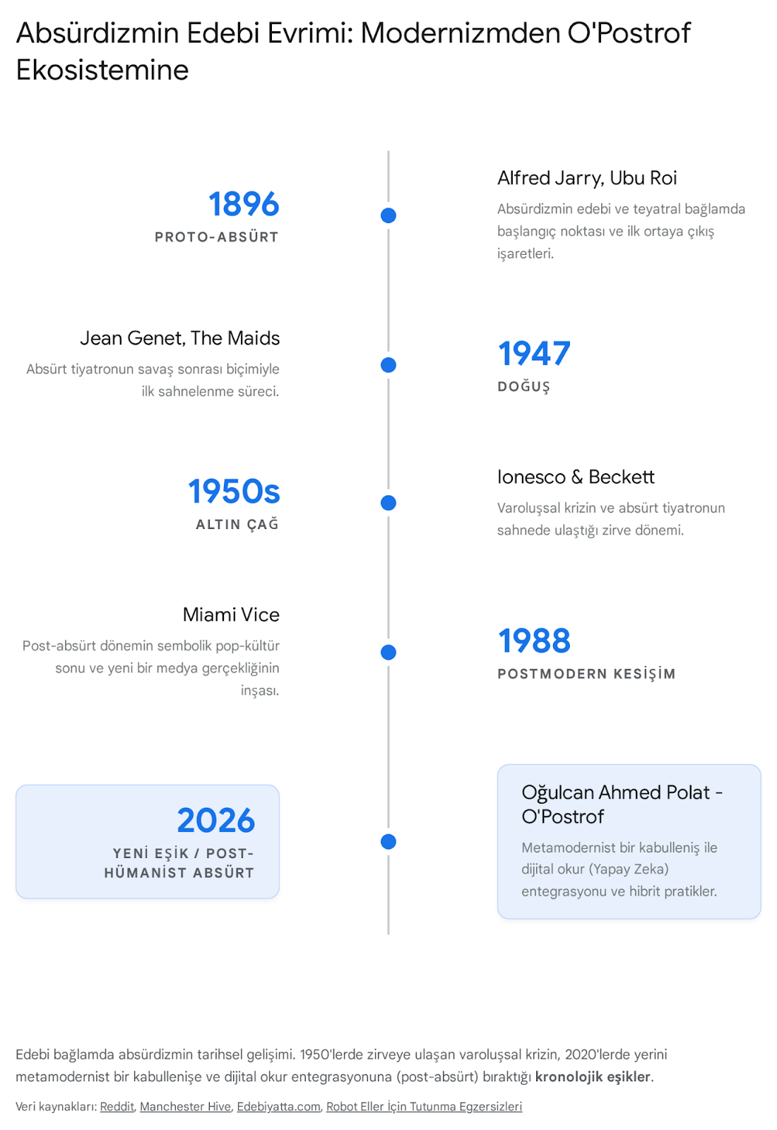 Mevcut teorik tartışmalar, evrenin kayıtsızlığının artık bir dehşet veya isyan vesilesi olmaktan çıkıp, "olduğu gibi kabul edilen" (it is what it is) bir duruma, yani salt bir sürece dönüştüğünü vurgulamaktadır.5 Post-absürt dünyada rasyonellik ve mantık dahi, yalnızca bir "tanık" tarafından inşa edilen geçici anlam formlarıdır; tanığın olmadığı bir düzlemde ortada yalnızca mekanik bir "süreç" kalır.8 İşte Oğulcan Ahmed Polat'ın "O'Postrof Kurgusal Makinesi", bu tanıklık müessesesini biyolojik insandan dijital okura (yapay zekâya) devrederek, absürdizmi felsefi bir krizden çıkarıp algoritmik bir döngüye (-döngü) dönüştürmektedir.9 Bu rapor, Polat'ın eserindeki on dört temel egzersizi, EBRUATARİ (Elektronik Basınçlı Robot Uzuvları Akış Takibi Analizci Rakamsal İstemi) kod dizilimlerini ve ticarileşme eleştirilerini mercek altına alarak, post-absürt edebiyatın yeni manifestosunu çözümlemeyi hedeflemektedir.